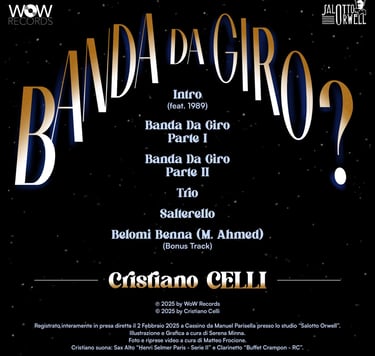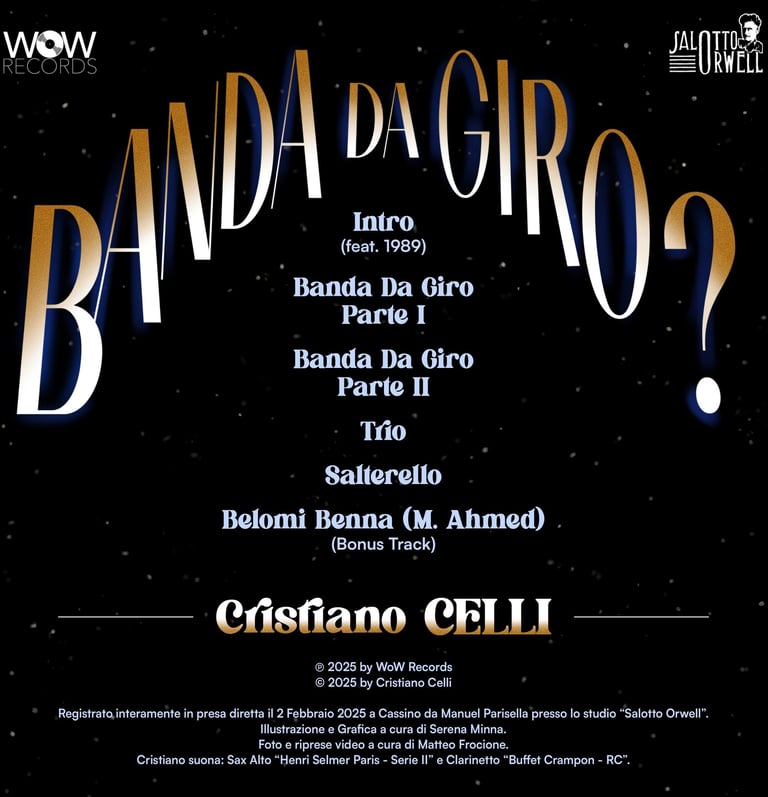 Pubblicato dall’etichetta indipendente Wow Records, disponibile su tutte le piattaforme digitali da sabato 29 novembre, Banda da Giro? è il nuovo lavoro discografico del sassofonista, clarinettista e compositore Cristiano Celli, accompagnato in questo album da Enrico Imperioli (corno francese), Moussa Bonaventura (contrabbasso) e Massimo Ceci (batteria), CD arricchito dalla presenza del rapper 1989 nel brano Intro, che ha registrato uno speech iniziale.